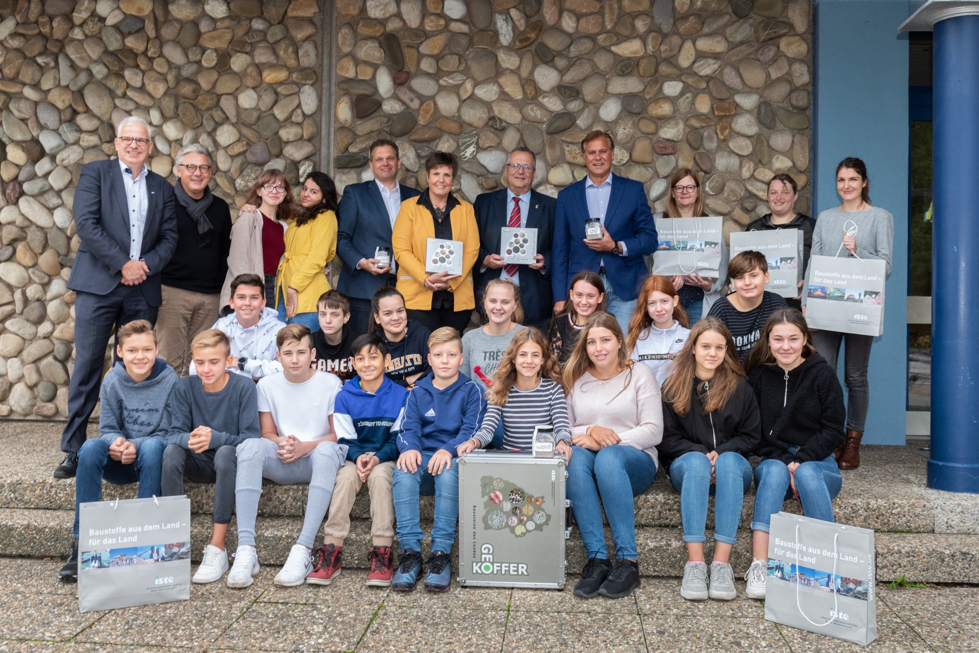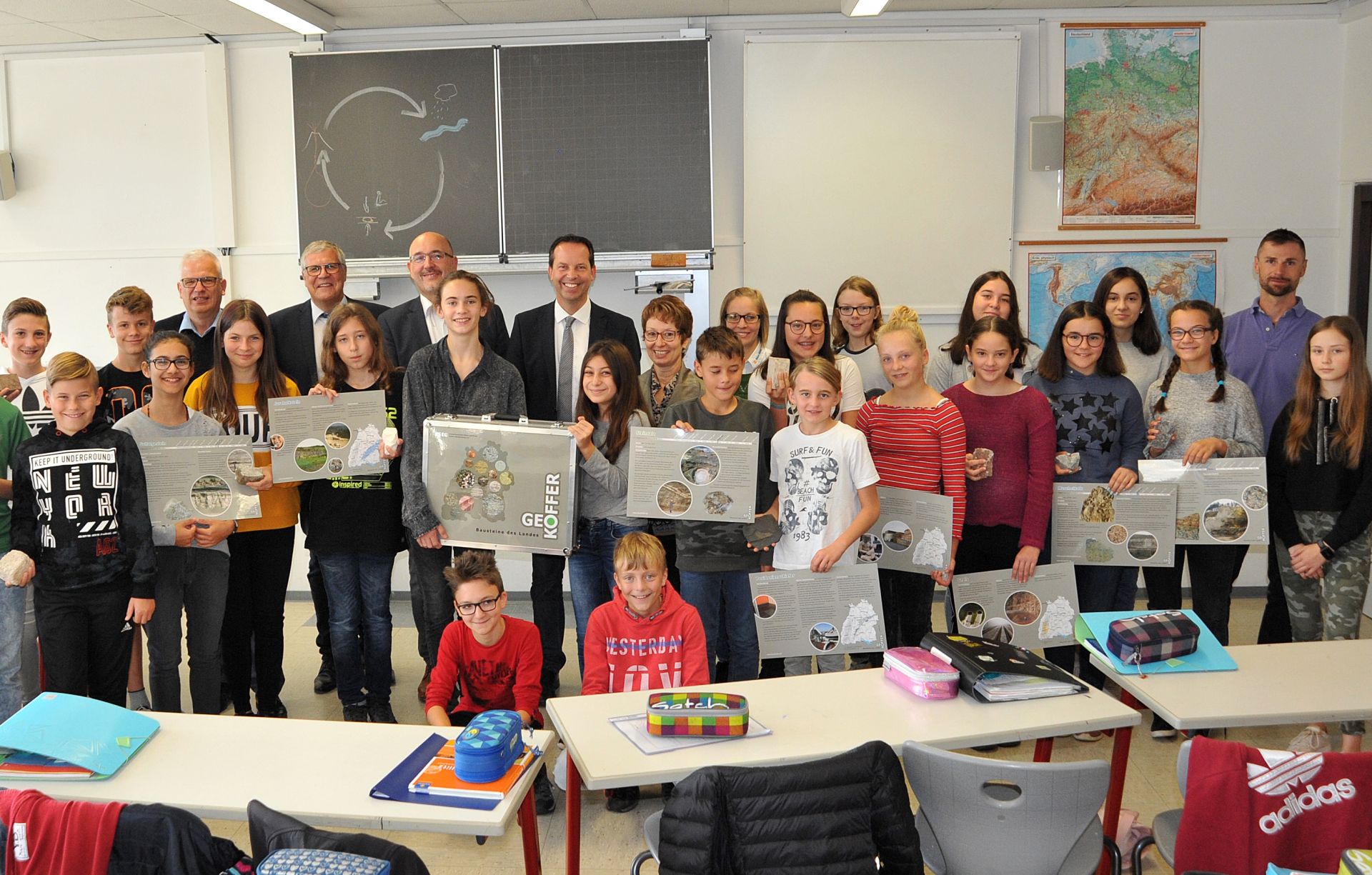 GeoKoffer-Übergabe am Nellenburg Gymnasium in Stockach mit der Landtagsabgeordneten Dorothea Wehinger (Bündnis 90/Die Grünen) und Unternehmer Andreas Drewing (Kieswerk Hardt GmbH & Co. KG): Schüler:innen der 6a präsentieren freudig das Anschauungsmaterial des GeoKoffers.