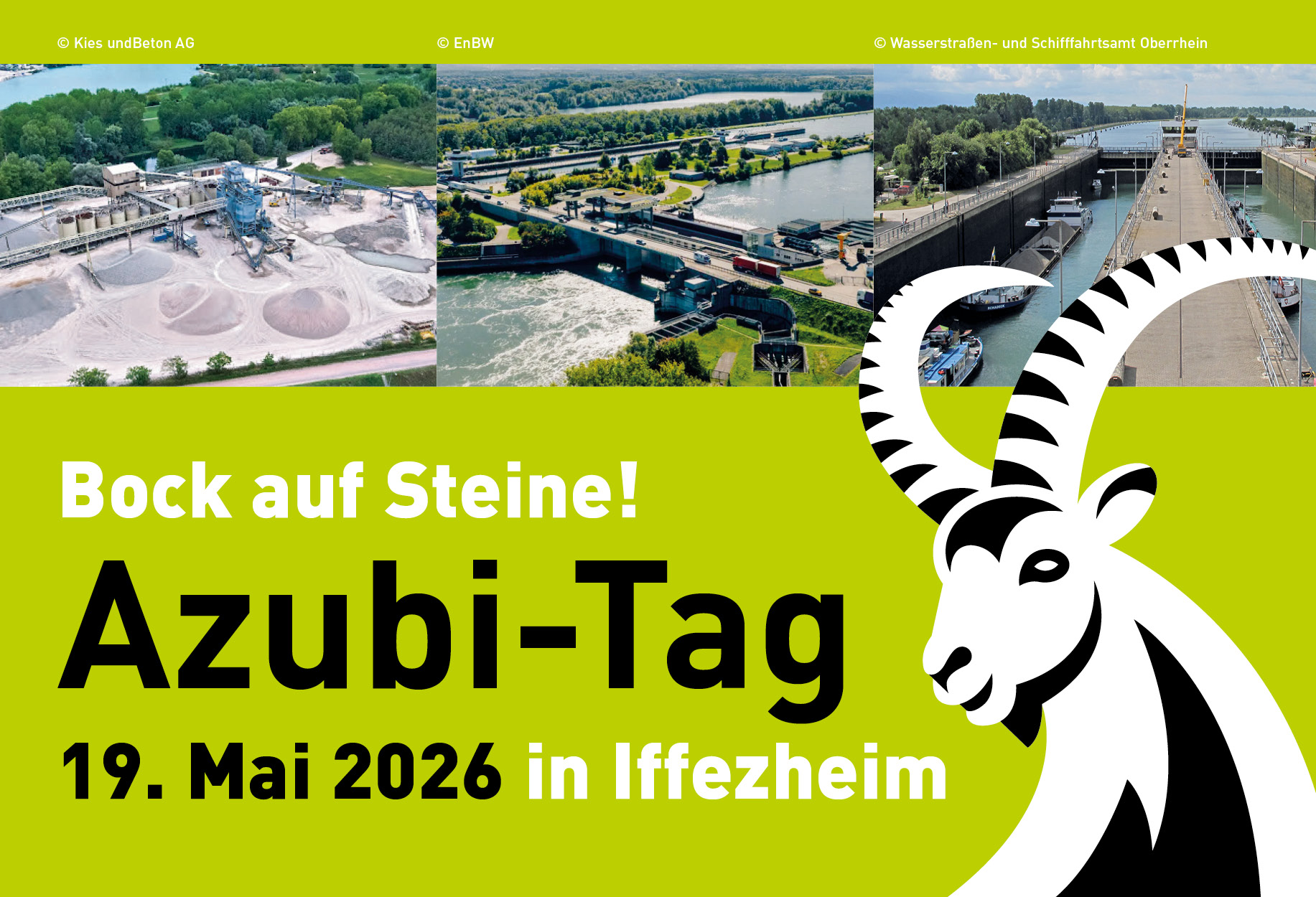 Azubi-Tag in Iffezheim |  | Das Motto unseres diesjährigen Azubi-Tags lautet "Vom Kies zum Beton für Energiegewinnung und Verkehrswege". Ihr könnt Euch für eine der drei spannenden und außergewöhnlichen Führungen anmelden. » mehr