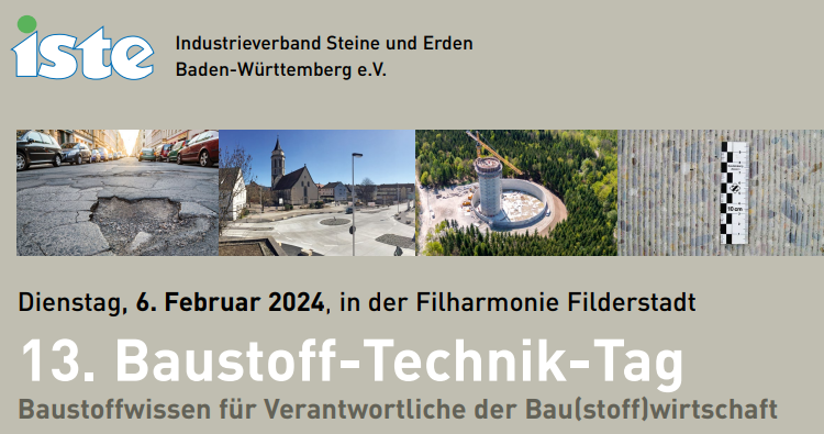 Einladung zum 26. Steine- und Erdenseminar - Genehmigungsverfahren für die Betriebe der Steine- und Erdenindustrie in Stuttgart |  | Der Industrieverband Steine und Erden Baden-Württemberg e.V. (ISTE), Ostfildern, lädt mit seinen Kooperationspartnern, DOLDE MAYEN & PARTNER und der ABBM, die Betriebe der Steine- und Erdenindustrie sowie Vertreter:innen der Verwaltungen von Kommunen und Ländern ins GENO-Haus nach Stuttgart ein. » mehr