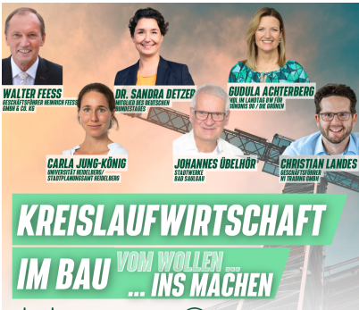 Fachgespräch „Vom Wollen ins Machen: Kreislaufwirtschaft im Bau“ |  | Dr. Sandra Detzer MdB und Gudula Achterberg MdL laden Sie im Namen der Fraktion GRÜNE im Landtag von Baden-Württemberg, ganz herzlich zum Fachgespräch ein. Die Veranstaltung bietet eine Plattform für den fachübergreifenden Austausch und die gemeinsame Entwicklung von Lösungen. » mehr